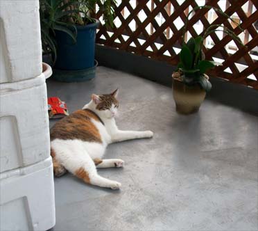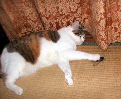 今年は何匹ゲットできるか・・・バニラが早朝からベランダに出たがってガラス戸の前に座り込んでいる。 戸を開けてやるとベランダへ飛び出てじっと蝉の来るのを待ち構えている。 今日、やっと蝉を一匹ゲット、部屋の中に持ち込んで遊んでいる。 妻は大の昆虫嫌い、バニラのやりたい放題。 夜帰って見たら、蝉は瀕死状態、羽が一本はずれていた。 |