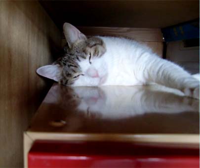 2日前には押し入れの金属製の引き出しの上で寝ていました