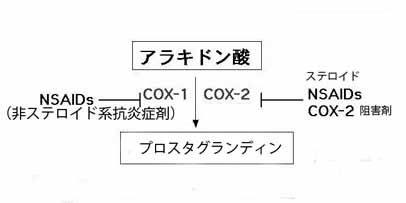 プロスタグランディンは消化器に対しては保護作用があり、悪さばかりをするものではない。COX1を阻害するとその作用が障害され胃腸障害を起こす。従って、COX2だけを阻害する鎮痛剤では胃腸障害の副作用が低減される。 |