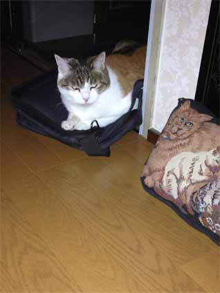 かばんとリュックが床に置いてあるとその上に座り込んでいます。