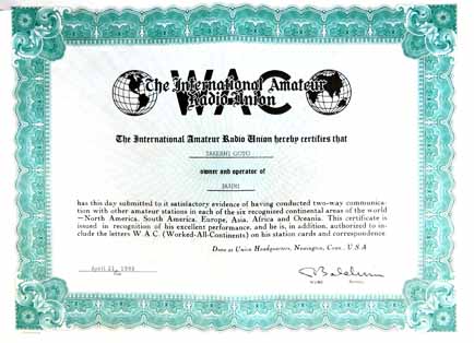 WAC(Worked -All-Continents) North America South America Europe Asia Africa Oceania 上記6大陸のアマチュア局と交信してQSLカードを 得て申請するアワード。 アワードとは賞状のことです。 |