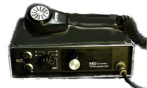 CQM2100 NECの144MHZ FM機 シンセサイザー機としてはじめて発売されたモービル機と思います。当時40チャンネルが実装(シンセサイザーによる周波数合成)が珍しくて買いました。しかし、当時の技術の限界か近くの周波数の混入が時々あり、性能としてはいまいちでした。 | ![]() |