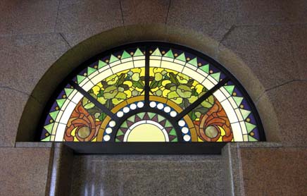 このステンドグラスと壁の花崗岩はは旧市庁舎のものです。(説明文より)