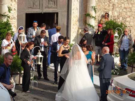 観光客がいっぱい見ているのに落ち着いたものでした。花嫁のお父さんにしては年寄りすぎるのでおじいさんでしょうか。 |