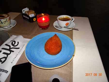 時差ぼけもあって、食欲がないのでシチリア名物のアランチーノとケーキを食べました。 |