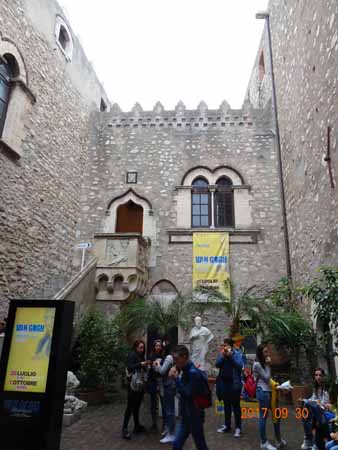 コルヴィヤ館は10世紀頃の中世の宮殿で、14世紀の終わりに建てられ、1538年から1945年にかけて所有していたタオルミーナの有名な貴族の名前にちなんで名付けられた。15世紀までに塔やアーチ型の窓やいろんなものが追加された。もともとここには902年に町を征服したサラセン人(アラブ人)の要塞があった。その前にはローマ時代の遺跡があった。
