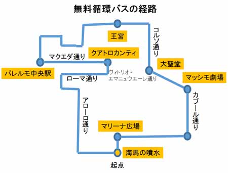 王宮前の停留所で少し待っていたら、無料バスが来た。それに乗ってマッシモ劇場付近で下車し、ホテルに戻った。