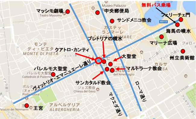 無料バスがノルマン王宮まで行くので市内の見物がてら、近くの停留所で無料バスに乗り込んだ。 |