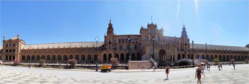 パビリオンとして建てられた広場内の建物は、セビリアをはじめアンダルシア地方の典型的な建築様式であるムデハル様式 を取り入れたもので、両翼に半円形に延びる回廊と、スペイン各県の歴史的出来事を描写した壁面タイル絵が特徴的である。