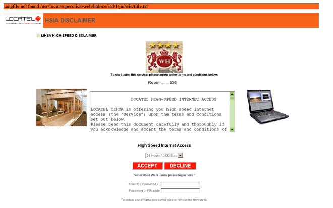 インターネット接続画面 ホテル『WINDOSOR』の有線LAN、即コネクトOK。使用料金なし。 |
