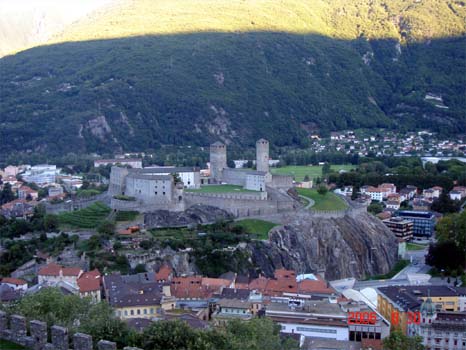 ティチーノ州の州都で、世界遺産に指定されているカステル・グランデ城が有名。カステル・グランデのほかにカステッロ・モンテベッロとカステッロ・ディ・サッソ・コルバロという2つの城がある。