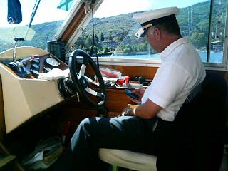 船を走らせながら携帯電話をしている船長 |