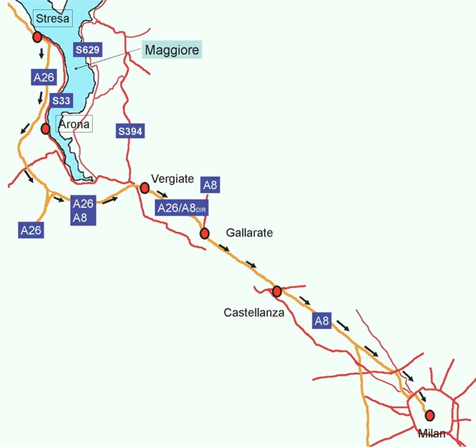 ストレーサから元来た方向に引き返し、ミラノに向け高速道路に入った。 |