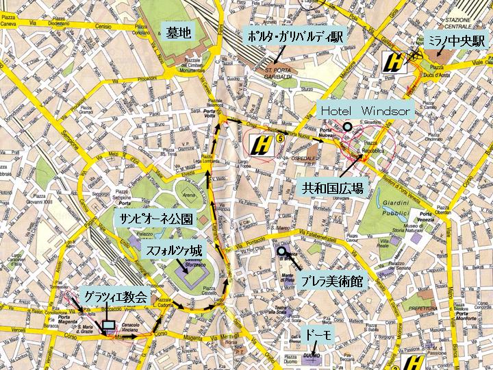 市内走行図、どう走ったのか分からないがグラツィエ教会へ出てきた |
