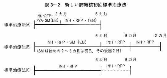 1)初回標準治療法 @標準治療法(A):2HRZS(またはE〉/4HR(Eを加えてもよい) 初期2カ月間はPZAを加えたINH・RFP・SM(またはEB)の4剤併用, その後INH,RFP(EBを加えてもよい)の2〜3剤併用4カ月間の合計6カ月間。 A標準治療法(B):6HRS(またはE)/3〜6HR INH・RFP・SM(またはEB〉の3剤借用6カ月間,その後INH,FPの2剤借用3〜6カ月間, 合計9〜12カ月間。(但し,SMは始めの2〜3カ月間は連日, B標準治療法(C):6〜9HR INH・RFPの2剤併用を6〜9カ月間。 2)適応基準 @喀痰塗抹陽性症例は,標準治療法(A)または(B)を施行する。 Aその他(喀痰塗抹陰性・培養陽性または陰性,気管支内視鏡下塗抹陽性,その他の症例)は病状により,標準治療法(A),(B),(C〉の中から適切なものを選択する。 |