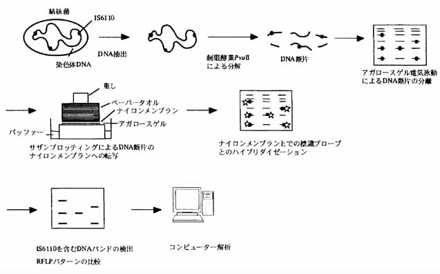 結核菌のDNAを特定の制限酵素で切断し、ゲル上に電気泳動すると切断されたDNAフラグメントの長さにより多数のバンドが検出され、結核菌株が異なればこの泳動パターンが異なる。 集団感染の際、複数患者の菌のRFLPパターンが一致した場合、同一菌から感染した可能性が考えられる。 DNAに変異があると制限酵素で切れたり、切れなかったりしてDNA断片の数や大きさが異なってくる。それが電気泳動のパターンの変化になってくる。 ![]() IS6110を用いたRFLP解析 これまでの報告では、IS6110は結核菌に通常5−20コピー存在しているが、1コピーのみや存在しない場合もある。通常コピー数が5以下の場合は、DR配列やPGRSなどの他のプローブを用いたRFLP解析によって型別を行う。 結核菌菌体からDNAを抽出し、制限酵素PvuUで分解後アガロースゲル電気泳動によりDNA断片を分離する。 ゲルからサザンプロソテイングによりDNA断片をナイロンメンブランに転写し、UV照射によってメンプランに固定する。 IS6110DNAの一部(245bp)を用いて標識DNAプローブを作成し、ハイブリダイゼーションを行う。ハイブリデイゼーション後、プローブと反応したメンブラン上のDNA断片を検出し、RFLPパターンを得る。数株間での比較はそのままパターンを比較するが、多数の菌株あるいはクラスター解析をする場合はコンピュータ解析を行う。 IS6110のRFLPパターンは菌株の継代培養を繰り返しても変化せず、また患者の長期にわたる継続排菌中でも全く変わらないか、変化しても1本のバンドの増減程度であることから、かなり安定であることが示されている。得られた各菌株のRFLPパターンの種類は非常に多く、多型性であることが示されているが、明らかな集団事例や共通の感染源が明らかな事例の場合は同一のパターンを示し、感染源・感染経路の追求に非常に有用であることが明らかにされている。 また、保持するIS6110のコピー数とRFLPパターンのクラスター分析から分離菌株間の類似性を調べ、特定地域あるいは国全体の結核菌株のRFLPパターンのデータベースを構築し、結核蔓延状況の解明のために利用されている例も多数報告されている。現在、IS6110を用いたRFLP解析は世界中で行われており、その方法は国際的に標準化を図られ、国際的なデータ比較が可能になりつつある。 『結核の分子疫学−結核対策における有用性』 長谷 篤 生活衛生 44(3)111-116より一部抜粋 |