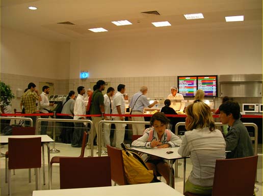 若い人もひげを生やしている人が多い カフェテリアで並ぶ人 |