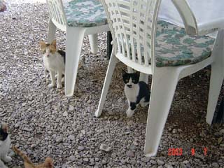 食事をしているとどからともなくネコが数匹現れて食べ物を催促する。
