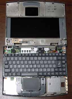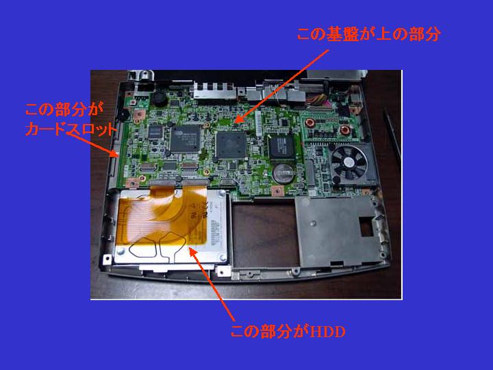 ◎Win95は起動できたが、カードが認識されない。 ◎もう一度La10を開けてよく見たら、基盤は2枚組になっている。 上の基盤を外すと、カードスロットがフラットケーブルで基盤とつがっている。 そのソケットにつながっているケーブルがはずれかけていたのでちゃんと差し込む。 ◎これでカード認識され正常起動された。 |