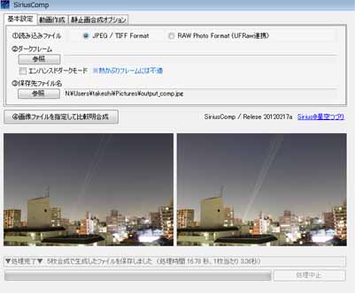 | このソフト操作がかなりシンプルで保存ファイルを決めて、画像を何枚か選び、比較合成をクリックすると、出来上がった画像のサムネイルが表示される。 ブルブ撮影で開放したままで長時間撮影は出来なかった(露出オーバー)のでこの方法が一番簡単だった |