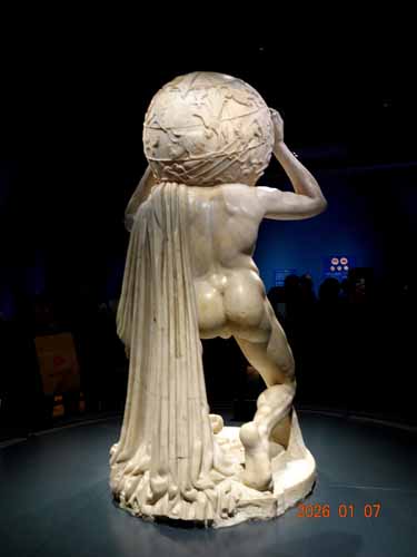 発掘時に残っていたのは天球と胴体、顔の一部のみであり、手足などは16世紀に補われたものだ。