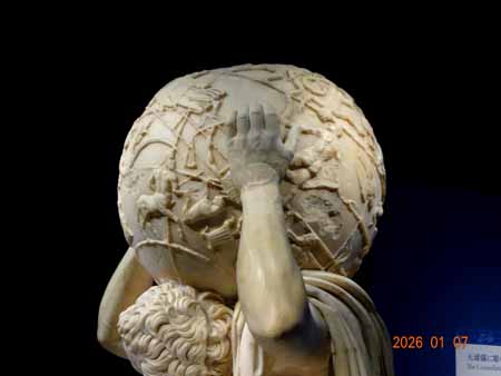 - アトラスが天球を背負う姿はギリシャ神話の伝統的な図像で、ローマ独自のアレンジが少ない。