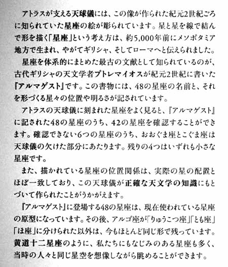 - 天球儀に刻まれた星座配置は ヒッパルコス(紀元前2世紀)の星表 と一致することが知られている。
