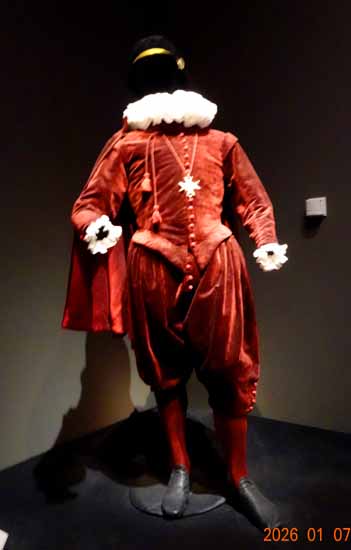 | この肖像画の衣装を再現する試みが実現し、天然素材と当時の縫製技術による再現品が展示されている。 |